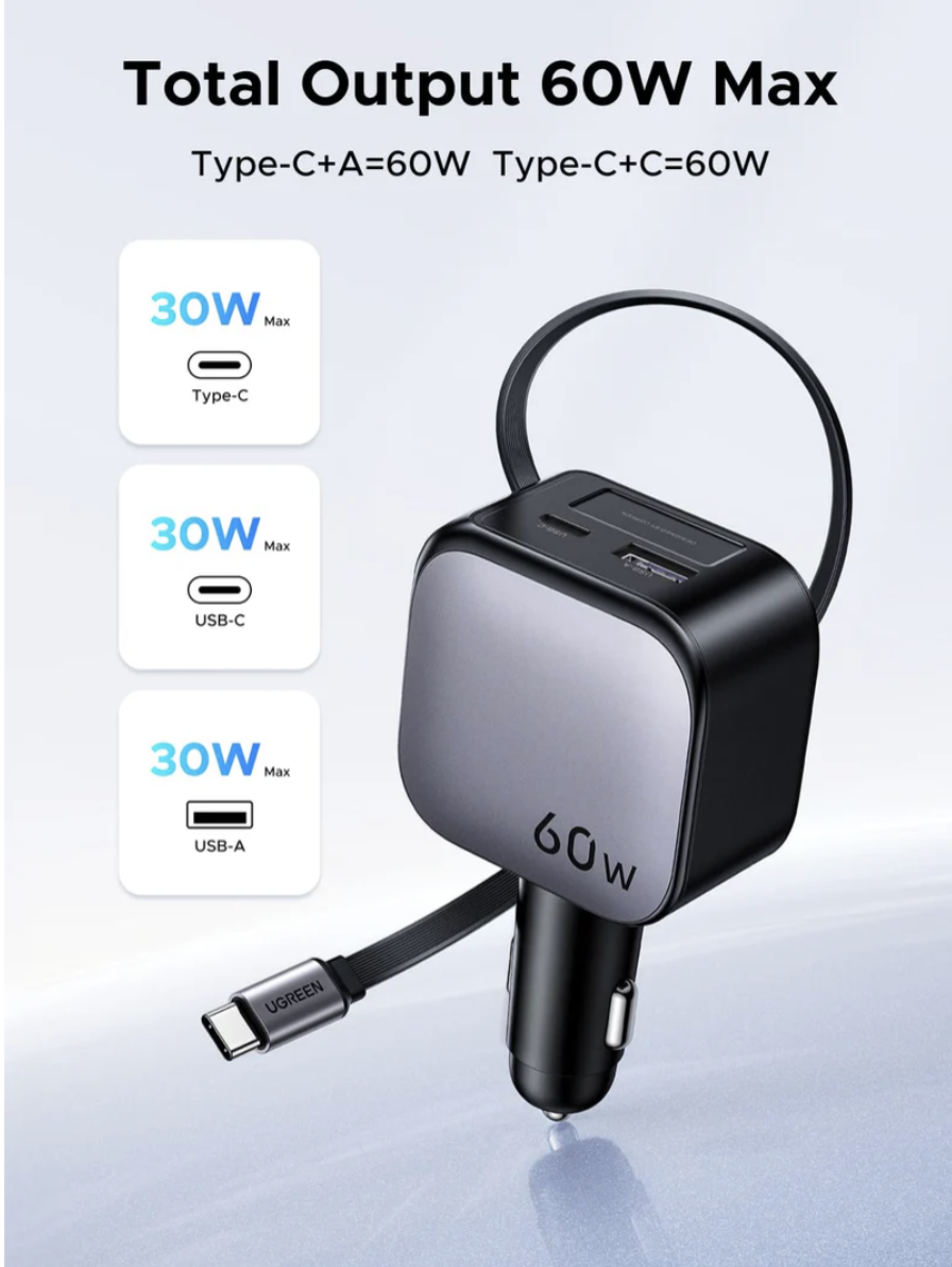 Cable retráctil incorporado de 70 cm: el diseño de tirar para extender mantiene limpio el interior de su automóvil y evita daños en el cable.